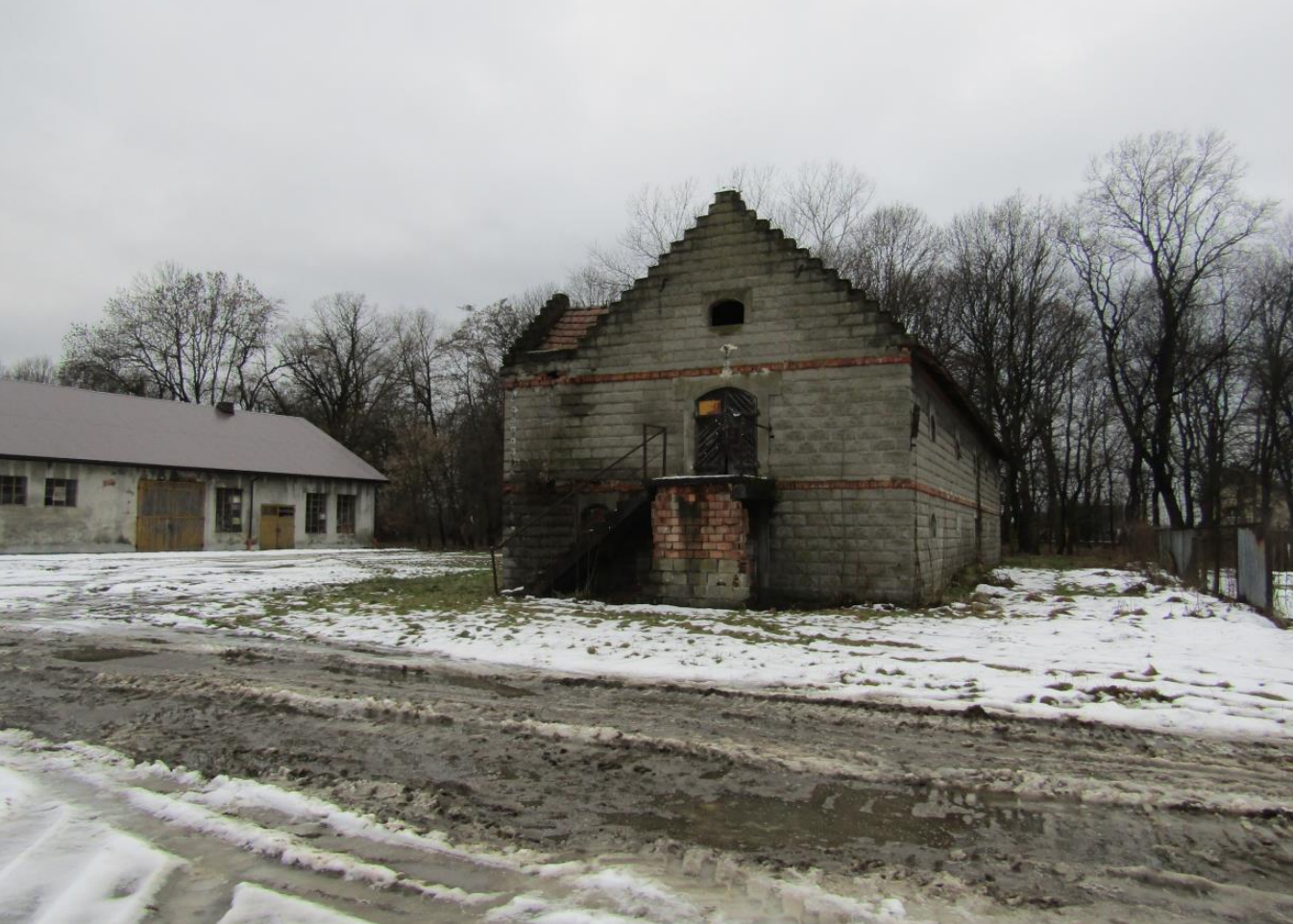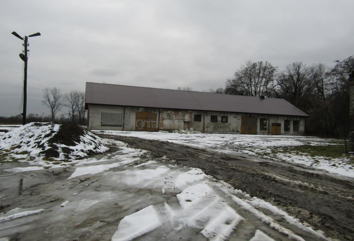 Na działce obiekt niemieszkalny wykonany w konstrukcji stalowej. Budynek parterowy o pow. użytkowej 469,47 m2. Dach w konstrukcji stalowej kryty blachą falistą. Ściany zewnętrzne obłożone częściowo blachą falistą, częściowo siatką stalową. Posadzka betonowa. Od strony południowej jedne wrota. Wiata wyposażona w instalację elektryczną. Aktualnie założony również monitoring.
