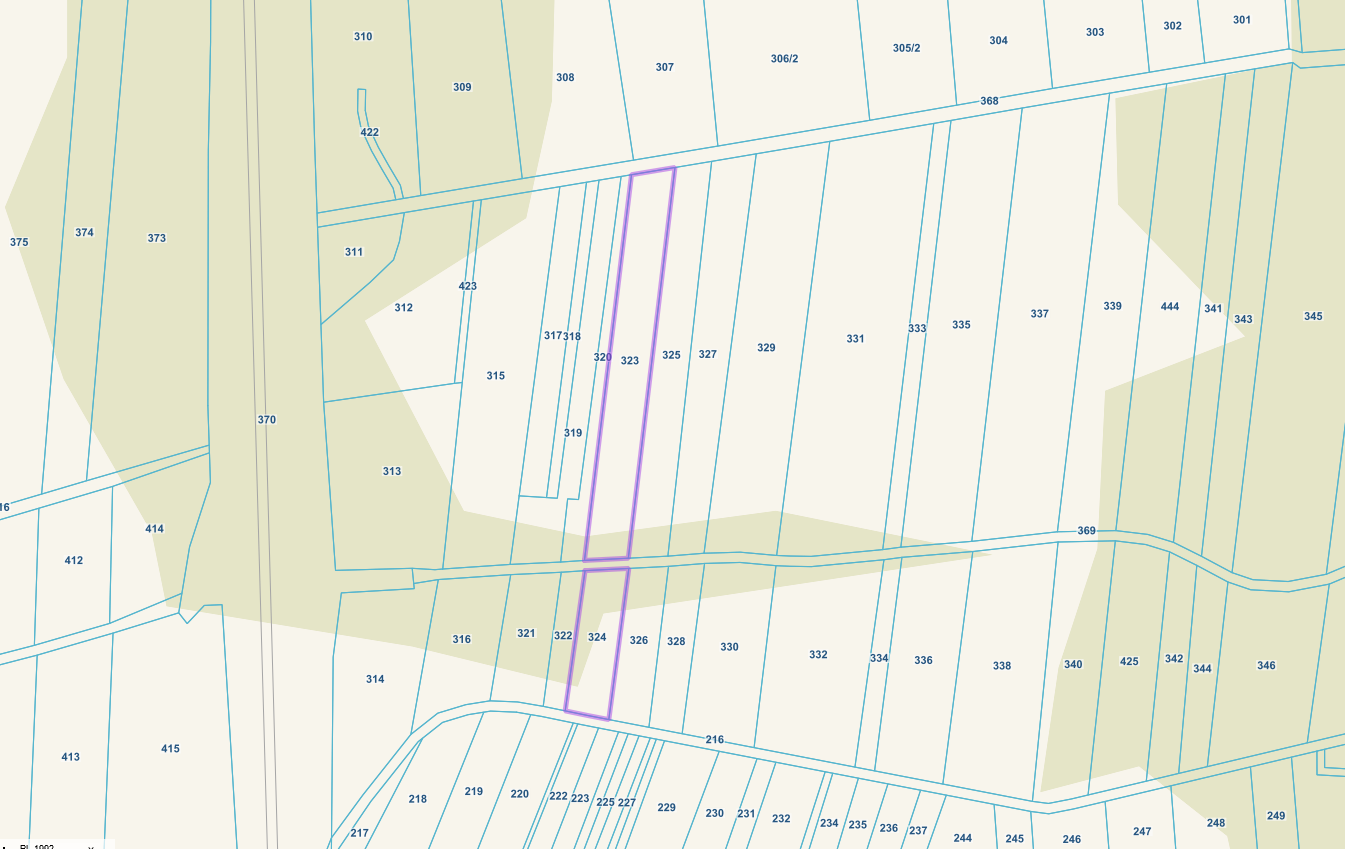 Działka o numerze ewidencyjnym 323 jest działką gruntu o powierzchni 0,25 ha w kształcie prostokąta o wymiarach około 17 m x 147 m. Teren działki niezabudowany, nieogrodzony. Ukształtowanie terenu płaskie. Brak utwardzeń. Działka nie posiada dostępu do drogi publicznej.