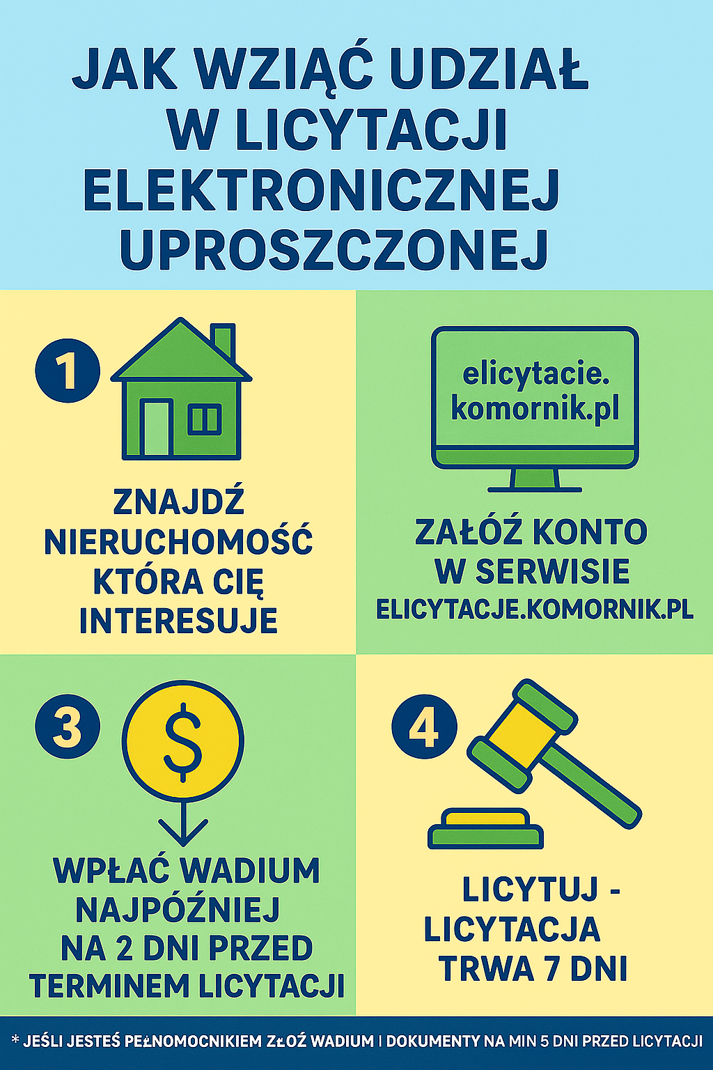 Przystąpienie do przetargu wymaga założenia konta w systemie teleinformatycznym obsługującym licytacje elektroniczne dostępnym pod adresem elicytacje.komomik,pl oraz zgłoszenia na dwa dni robocze przed rozpoczęciem przetargu, jeżeli licytant licytuje we własnym imieniu lub na 5 dni przed terminem przetargu jeżeli licytant bierz.e udział w licytacji jako pełnomocnik innej osoby, jak również wpłacenia rękojmi najpóźniej na 2 dni robocze przed rozpoczęciem przetargu, jeżeli jest obowiązek złożenia rękojmi. Licytant, który licytuje we własnym imieniu i nie ma obowiązku złożenia rękojmi, może przystąpić do przetargu aż do momentu jego zakończenia.
