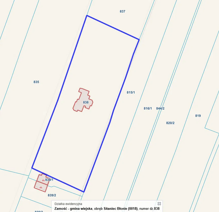 Nieruchomość opisana jako nieruchomość gruntowa zabudowana składająca się działki nr nr 838 (dawniej działka nr831/2) o pow. 0,5600 ha położona w miejscowości Sitaniec Błonie, dla której Sąd Rejonowy w Zamościu II Wydział Ksiąg Wieczystych prowadzi księgę wieczystą o numerze KW ZA1Z/OOOxxxxx/4.
