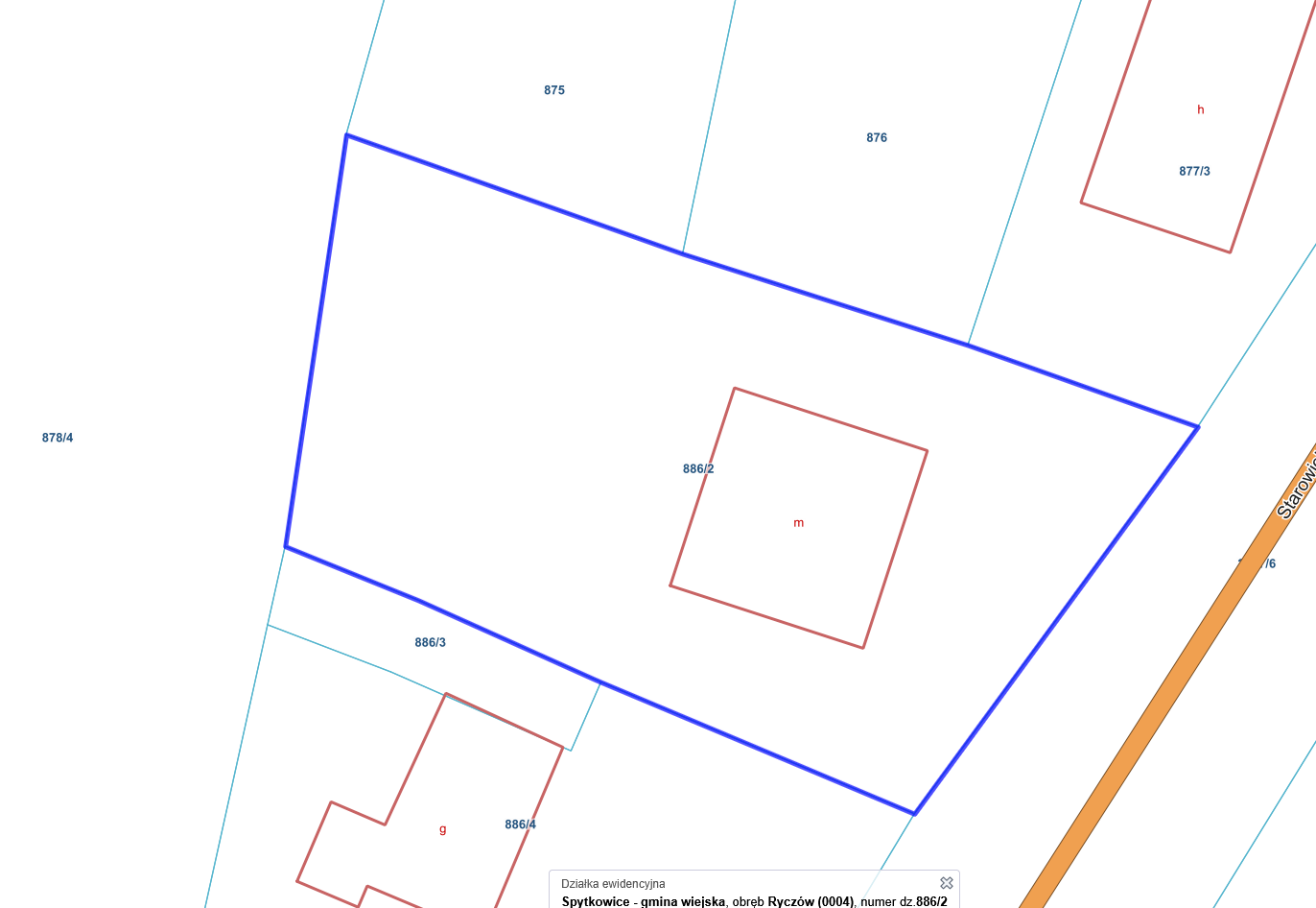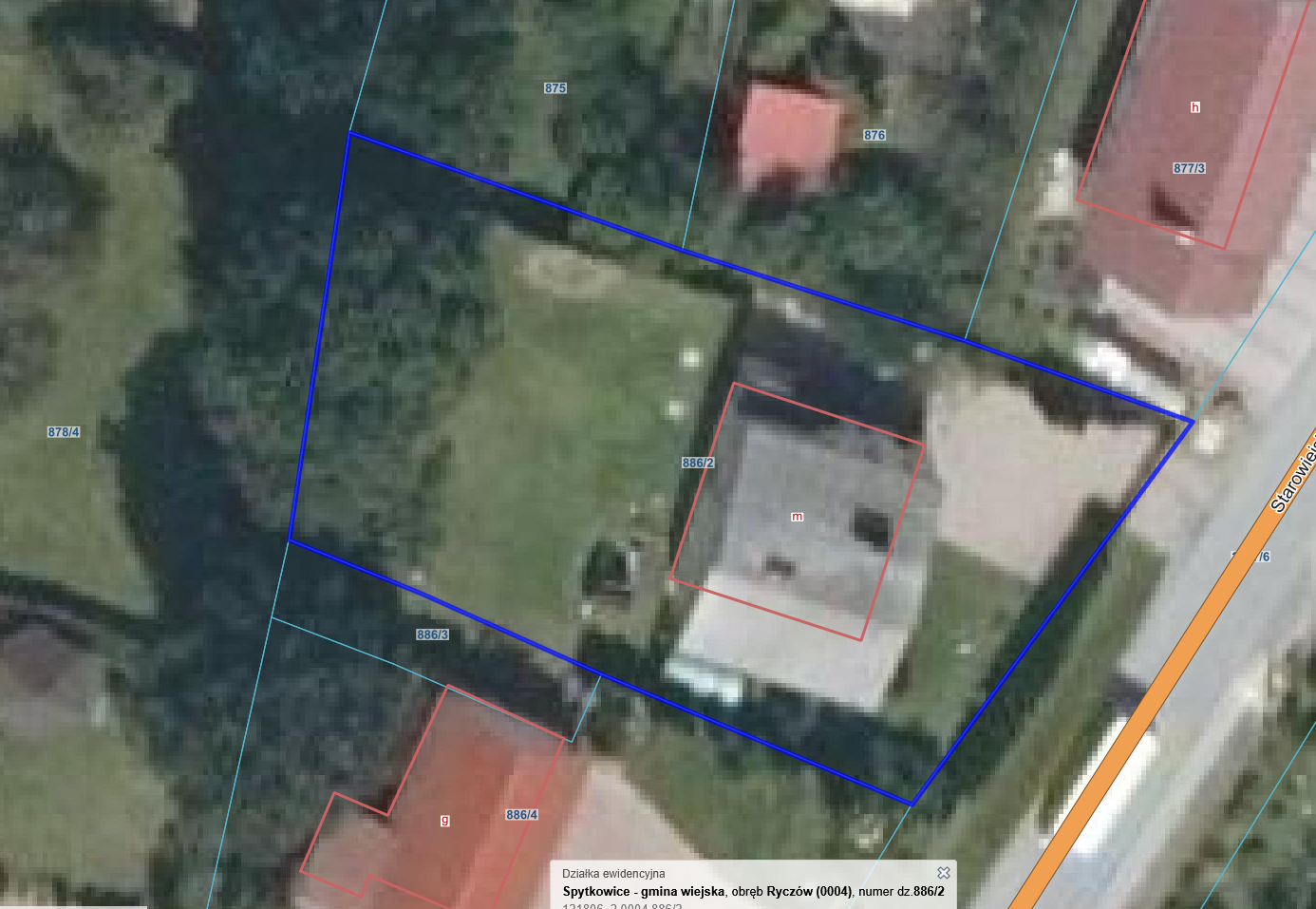 Przedmiotem licytacji jest zabudowana działka nr 886/2 o pow. 0,0857ha. Wyceniana nieruchomość gruntowa ma kształt regularny o wymiarach ok. 22 x 42m. Teren nieruchomości jest równy, o stałej poziomej konfiguracji. Nieruchomość jest ogrodzona i zabudowana budynkiem mieszkalnym jednorodzinnym. Przy budynku urządzono trawnik z drzewami i krzewami ozdobnymi, oraz podjazd do drogi. Nieruchomość usytuowana jest bezpośrednio przy drodze gminnej o nawierzchni asfaltowej, na którą ma urządzony zjazd.