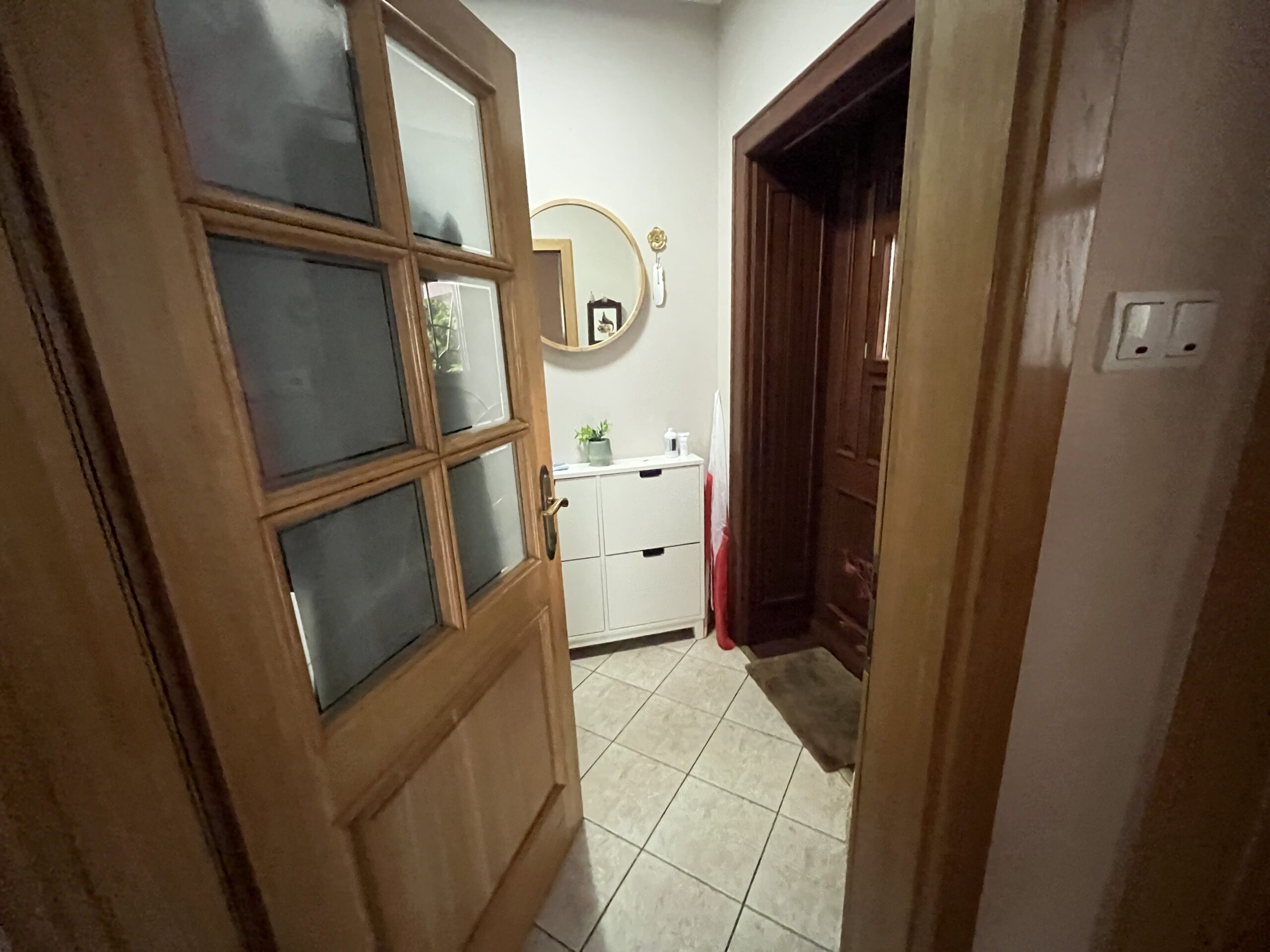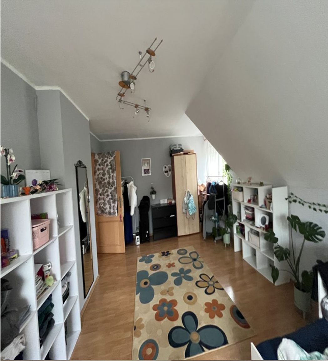 Na poddaszu: 3 pokoje, łazienka z WC (opłytkowana, wyposażona w wannę, kabinę prysznicową, umywalkę, WC) oraz przedpokój. Ponadto balkon. W piwnicy znajduje się kotłownia, garderoba, pralnia oraz garaż.