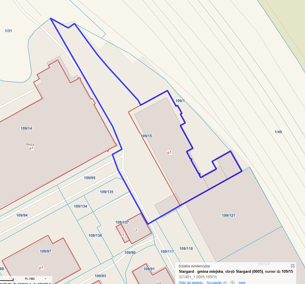 Przedmiotem licytacji jest ww. udział w prawie uży tkowania wieczystego działki gruntu o nr ew. 109/15 o pow. 5 116 m2 zabudowanej halą produkcyjną o pow. 2 219 m2. Obecnie budynek nie jest użytkowany oraz, nie jest wykonywana umowa dzierżawy ujawniona w księdze wieczystej. W budynku magazynowane są chemikalia nieznanego pochodzenia w ilości nie mniejszej niż. 750 sztuk opakowań typu mauzer o poj. 1000 dm3 każdy, co stanowi nielegalne składow isko odpadów.