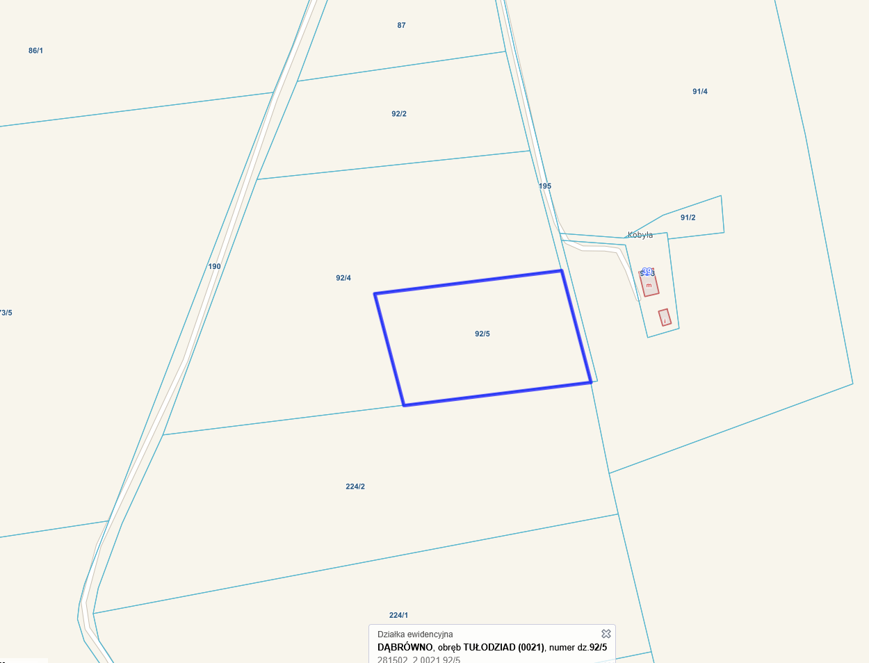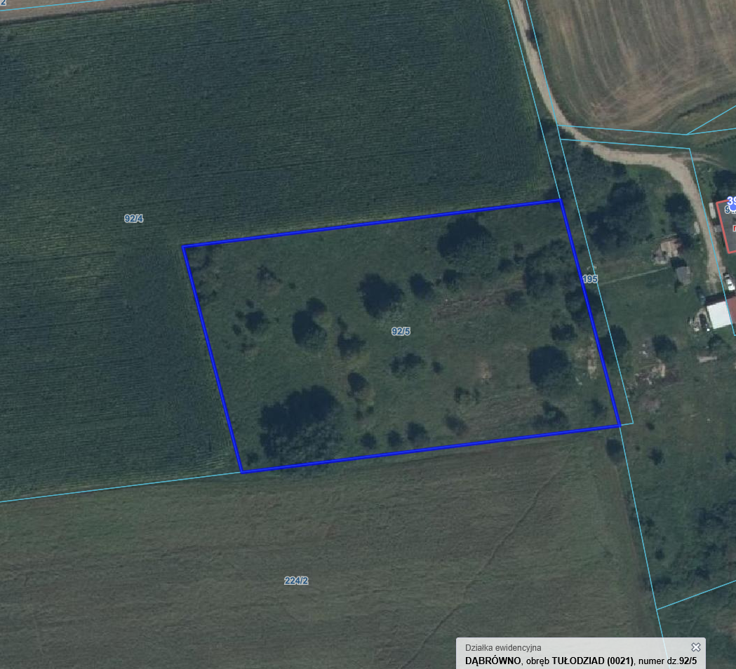 -działka niezabudowana rolna nr 92/5 o pow. 0,6829 ha we wsi Tułodziad – siedlisko Kobyła, gm. Dąbrówno (identyfikator działki:281502_2.0021.92/5). Teren działki płaski, kształt regularny zbliżony do trapezu o proporcjonalnych bokach. Klasa gruntu: grunty rolne zabudowane Br-RIIIb – 0,0174 ha, grunty rolne zabudowane Br-RIVa – 0,6399 ha, grunty rolne zabudowane Br-RV – 0,0256 ha. Na części działki widoczne są fundamenty najprawdopodobniej po byłych budynkach gospodarczych. Działka porośnięta trawą oraz samosiewem drzew iglastych i liściastych.