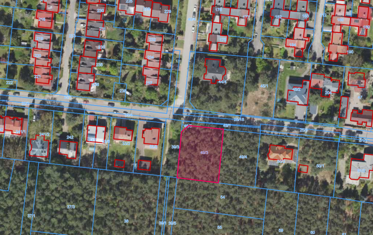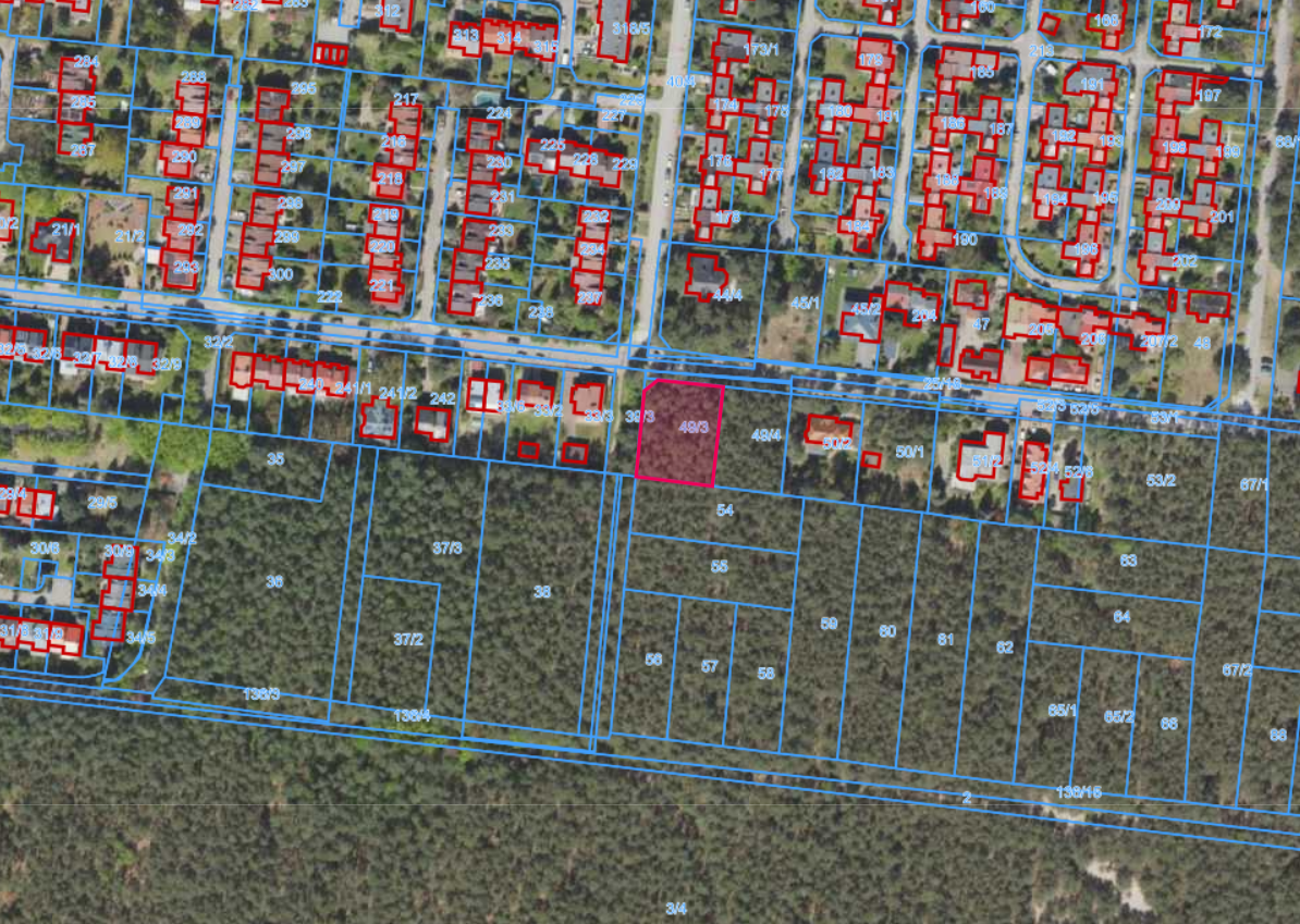 Działki ewidencyjna oznaczona numerem 49/3, w obrębie 80505 o powierzchni 1157m2. Nieruchomość jest porośnięta lasem. Kształt działki regularny, zbliżony do kwadratu. Ukształtowanie terenu regularne. Zalesienie: Bór świeży. Drzewostan – sosna 70 lat. Dostęp do drogi – ul. Podleśna.