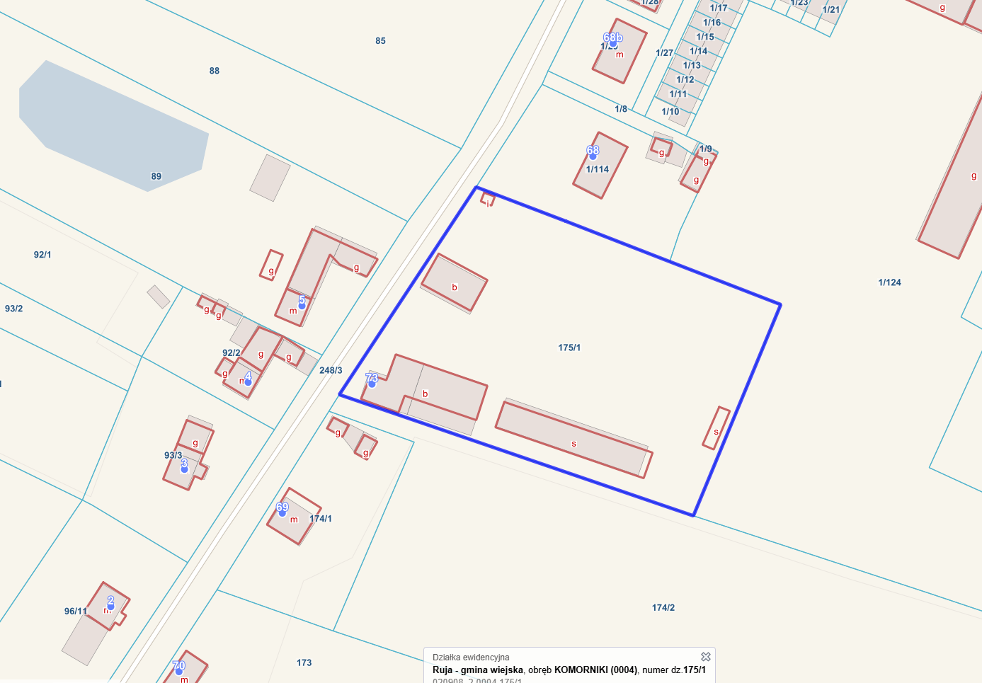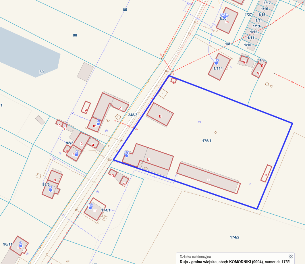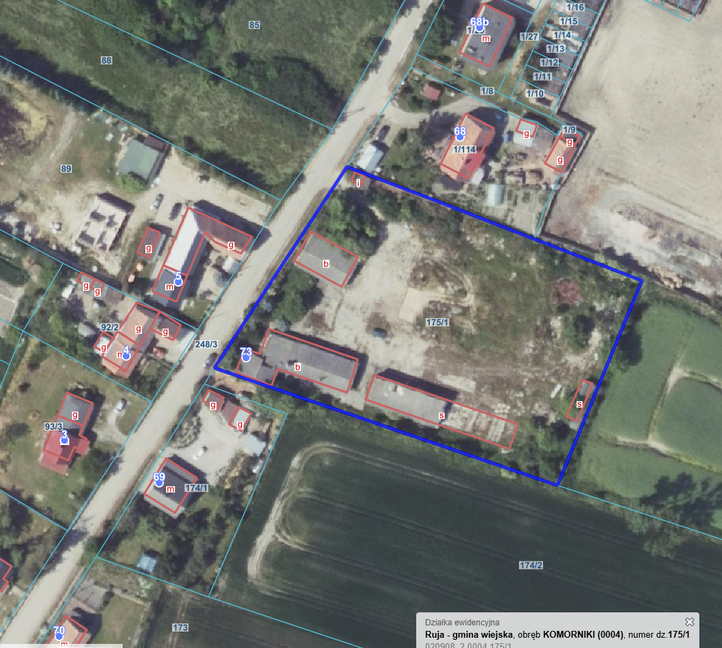 Prawo własności nieruchomości gruntowej zabudowanej budynkami magazynowo-warsztatowo- biurowym wraz z naniesieniami i infrastrukturą techniczną, działka numer 175/1, położona w Komornikach 73, obręb 0004, gmina Ruja, powiat legnicki, województwo dolnośląskie, dla której prowadzona jest Księga Wieczysta o numerze LE1L/000xxxx/0 przez Sąd Rejonowy w Legnicy V Wydział Ksiąg Wieczystych.