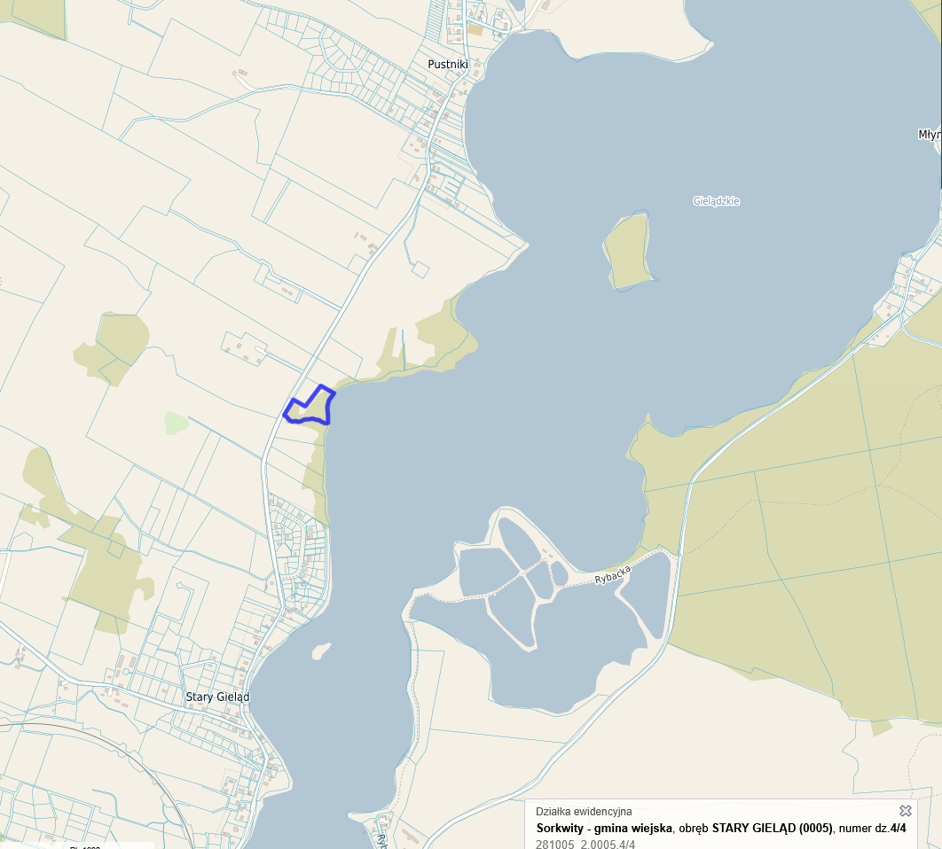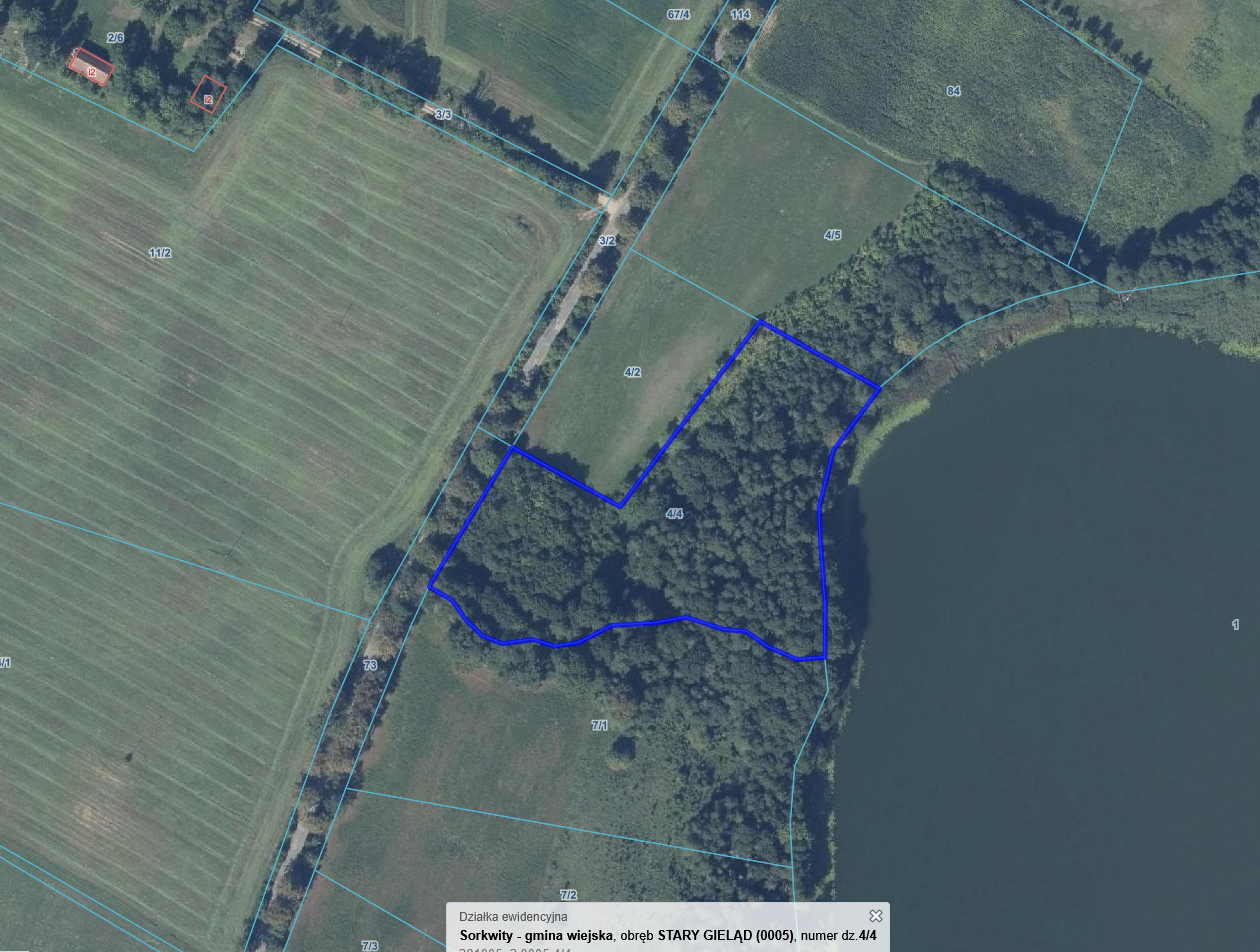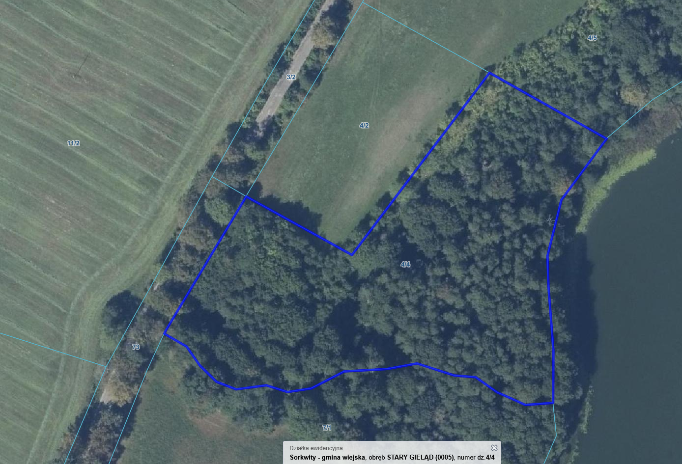nieruchomości stanowiącej działkę gruntu oznaczoną w ewidencji gruntów numerem 4/4 o powierzchni 1,2000 ha położonej Stary Gieląd, gm. Sorkwity, dla której Sąd Rejonowy w Mrągowie IV Wydział Ksiąg Wieczystych prowadzi księgę wieczystą o numerze OLlM/000XXXXX/5 , niezabudowanej.