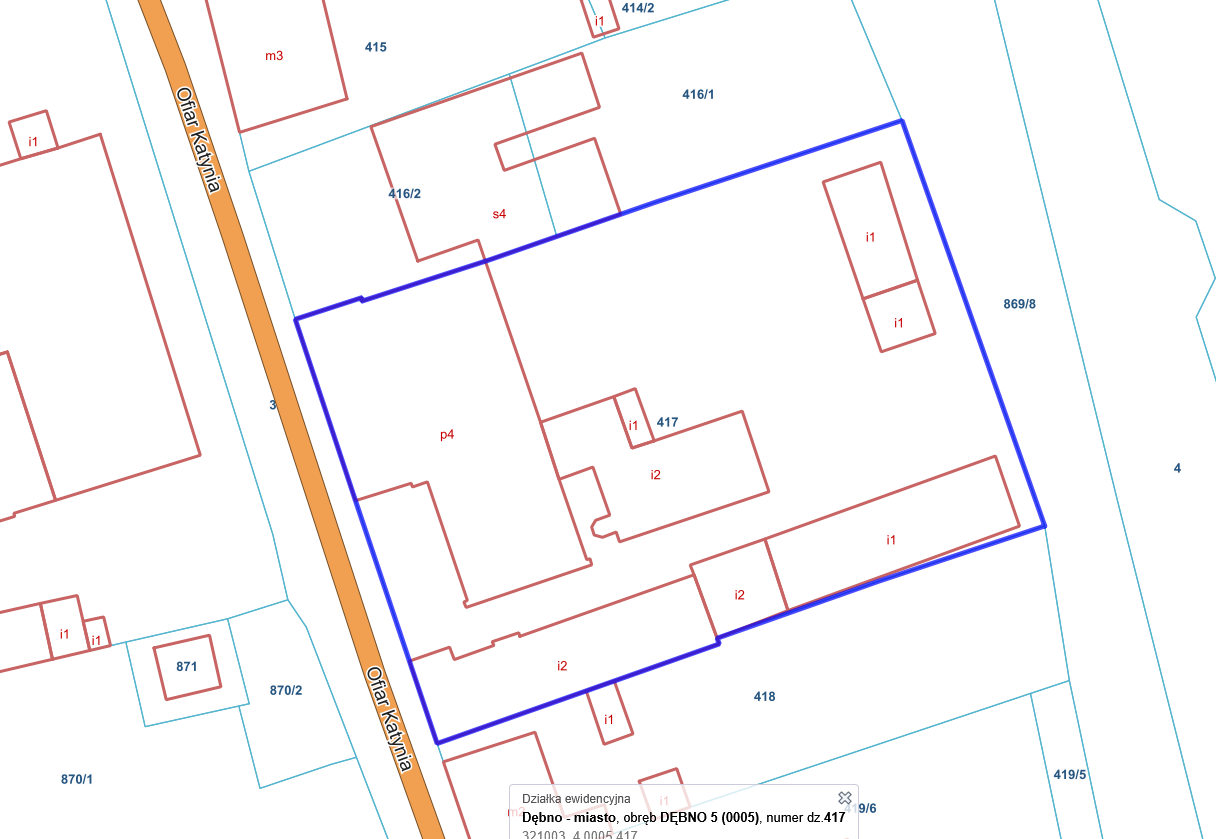 Nieruchomość położona jest pod adresem: 74-400 Dębno, ul. Ofiar Katynia 13, gmina Dębno, powiat myśliborski, woj. zachodniopomorskie. Sąd Rejonowy w Myśliborzu V Wydział Ksiąg Wieczystych prowadzi dla tej nieruchomości księgę wieczystą o symbolu SZ1M/000xxxx/4.