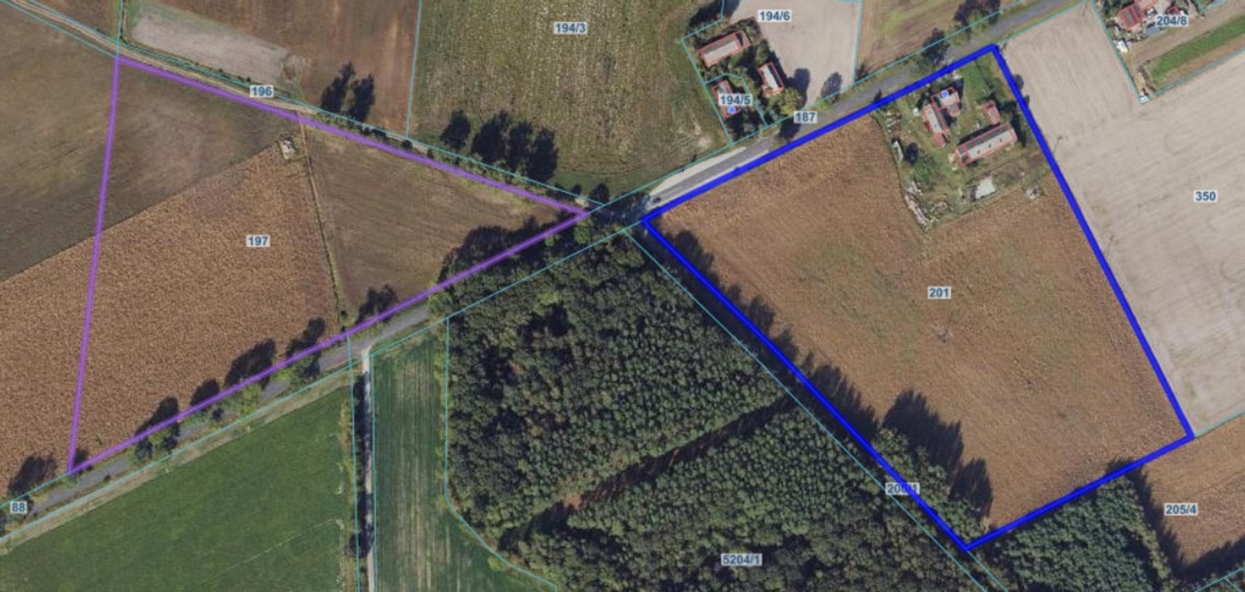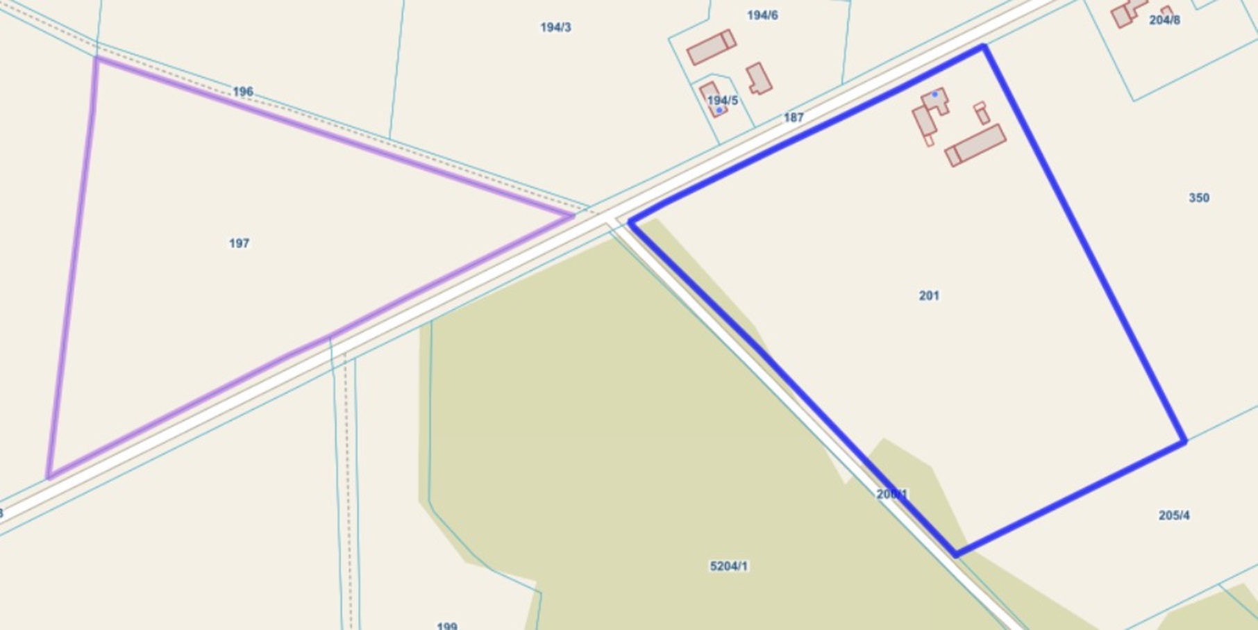 Działka gruntu nr 201, o obszarze 4.5700 ha, w tym: – pow. 0.1000 ha – lasy – Ls V – pow. 0.1800 ha – grunty rolne zabudowane – Br-RV – pow. 4.1800 ha – grunty orne – R V – pow. 0.1100 ha – pastwiska – Ps IV Działka ta jest zabudowana następującymi budynkami: – budynek mieszkalny jednorodzinny o pow. zabudowy 130 m^ – budynek garażowo-gospodarczy o pow. zabudowy 55 m2 – budynek gospodarczy o pow. zabudowy 340 m2 – budynek gospodarczy o pow. zabudowy 150 m2 Łączna powierzchnia użytkowa zabudowań: 675 m2 Działka w kształcie regularnego czworokąta, ukształtowanie terenu płaskie. Przednia linia zabudowy położona frontem do krawędzi drogi. Teren na nieruchomości w części zabudowanej nieutwardzony, częściowo ogrodzony (część zabudowana). Działka posiada uzbrojenie w sieci: wodociąg, energia elektryczna, bezodpływowy zbiornik na ścieki. Otoczenie stanowi zabudowa wiejska zagrodowa oraz grunty niezabudowane. Dojazd do nieruchomości odbywa się drogą o nawierzchni asfaltowej. Dostęp do drogi poprzez działki nr 187 oraz 200/1, stanowiące drogi gminne.