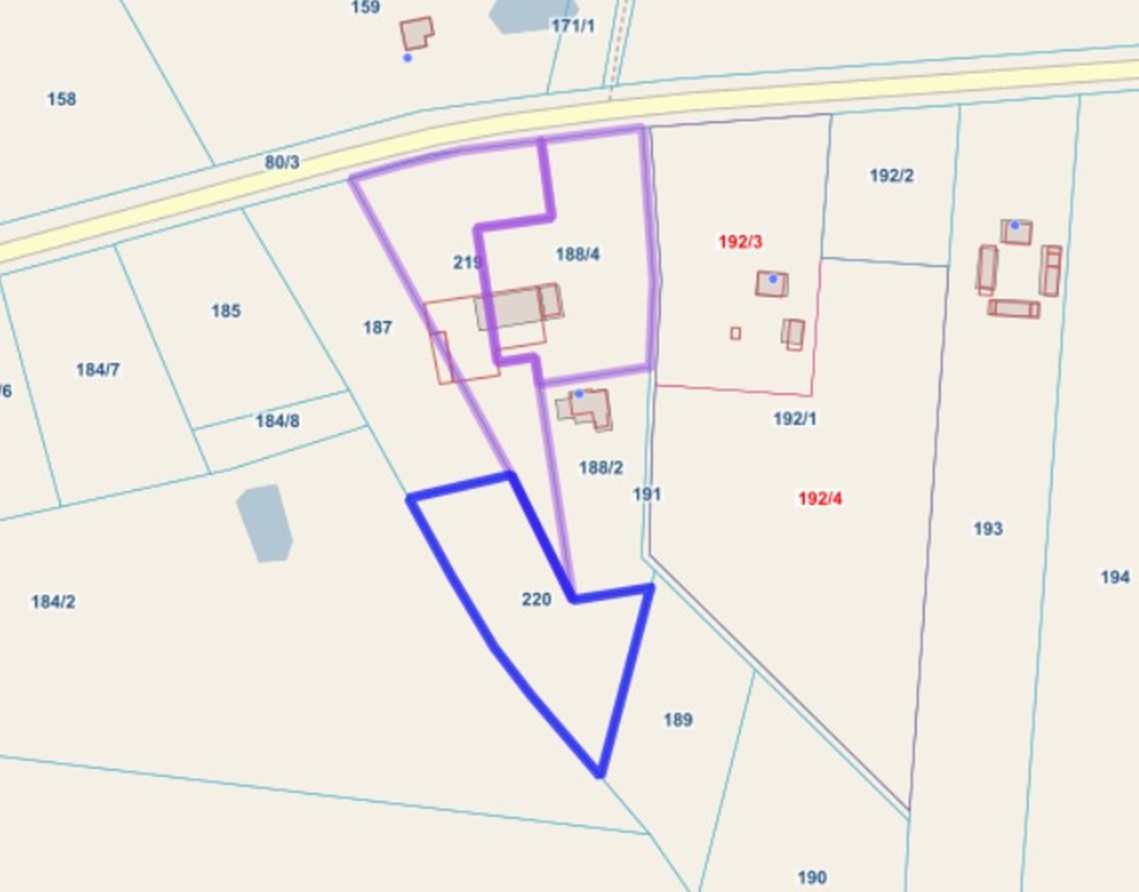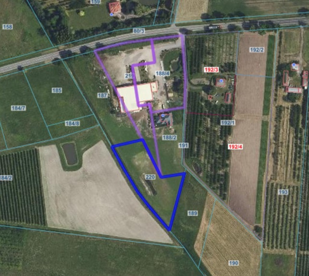 Działki tworzą kompleks w kształcie wieloboku o łącznej powierzchni 1,4698 ha. Teren działek jest płaski z obniżeniem terenu na działce numer 220 [łąka] i w południowej części działki numer 219 [pastwisko]. Kompleks od drogi wojewódzkiej oddziela dość głęboki rów lecz zjazd z tej drogi jest urządzony na wysokości drogi gminnej. W tym miejscu jest brama wjazdowa z elementów metalowych [działka nr 188/4] oraz jest kilkanaście przęseł ogrodzeniowych z elementów metalowych. Od strony drogi gminnej jest ogrodzenie z siatki plecionej. Takie samo ogrodzenie jest od strony drogi wojewódzkiej. Z pozostałych stron działka nie jest ogrodzona. Na działce od strony drogi gminnej są nasadzenia krzewów, z wydzielonym miejscem rekreacyjnym. Jest też niewielki staw, altana z dachem dwuspadowym o wymiarach 3mx5m=15m2 posadzka z płytek betonowych. Nasadzenia roślinne ozdobne są także przed budynkiem niemieszkalnym. Teren działki plaski z frontu przed budynkiem utwardzony tłuczniem. Na działkę są wykonane przyłącza infrastrukturalne w postaci energii elektrycznej i gazu ziemnego. Jest studnia głębinowa o głębokości 40 metrów z której wykonane są przyłącza do budynku niemieszkalnego oraz do budynku mieszkalnego zlokalizowanego na działce numer 188/2. Na działce jest też szambo do którego przyłączony jest budynek niemieszkalny oraz budynek mieszkalny zlokalizowany na sąsiedniej działce numer 188/2. Przy budynku socjalnymi i hali magazynowej wylana jest pływa betonowa na której stawiane są ścianki z płyty warstwowej wysokości 3 metry i o powierzchni użytkowej obiektu 98,13 m2. Wzdłuż zachodniej granicy działki numer 220 jest rów melioracyjny zwykły na powierzchni i teren jest ze skłonem w kierunku tego rowu. Dla nieruchomości urządzona jest księga wieczysta numer KW RAlG/000XXXXX/7 prowadzona w Sądzie Rejonowym w Grójcu. Nieruchomość oszacowana jest na kwotę: 1 000 000,00 zł.