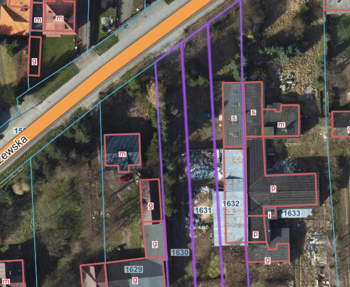 Działka nr 1632 zabudowana jest murowanym budynkiem biurowo-usługowym oraz budynkiem hali magazynowej o konstrukcji lekkiej. Budynek biurowo-usługowy jest obiektem parterowym, bez podpiwniczenia o powierzchni użytkowej 120 m2. Do budynku doprowadzona sieć energii elektrycznej, sieć wodociągowa oraz telefoniczna, kanalizacja lokalna – szambo. Budynek hali magazynowej jest obiektem parterowym o konstrukcji lekkiej – stalowej, posadowiony na fundamentach. Wrota automatycznie suwane. Powierzchnia użytkowa – 247 m2. Na terenie działki 1631 wybudowany jest betonowy basen, zaniedbany i porośnięty krzewami.