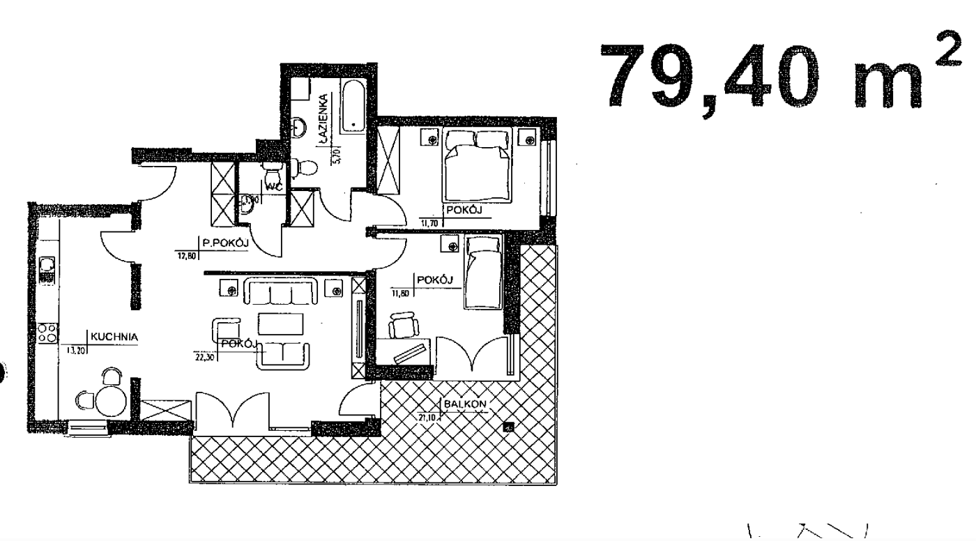 – lokal mieszkalny o Puż (Powierzchnia użytkowa lokalu na podstawie wypisu z rejestru lokali)=79,40 m2 oraz strukturze: według KW: pokój-3, kuchnia-1, łazienka-1, WC-1, przedpokój-1, według oględzin: pokój z aneksem kuchennym, pokój-2, łazienka-1, WC-1, przedpokój-1, balkon-1, według rzutu: pokój-3, kuchn1ia-1, łazienka z WC-1, WC-1, przedpokój-1, balkon-1 położonego: 90-560 Łódź, ul. Karolewska
