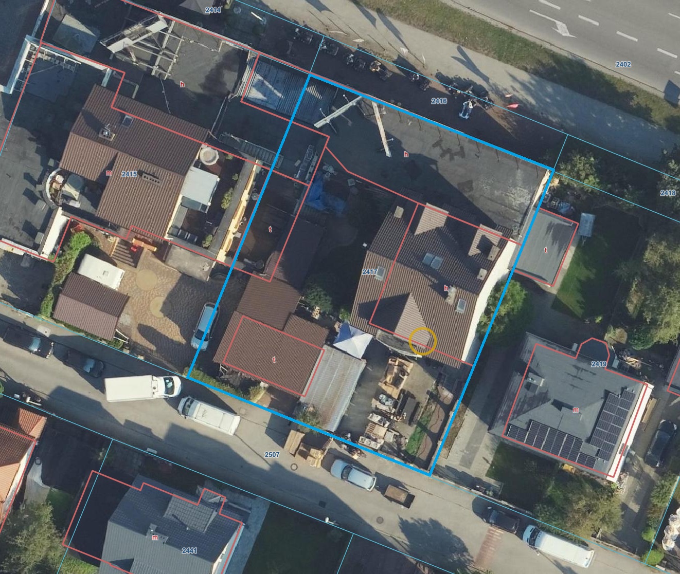 Działka ma kształt regularnego wieloboku zbliżonego do prostokąta z bezpośrednim dostępem do ul. Mylnej. Na terenie działki zlokalizowane są: budynek mieszkalno-usługowy składający się z przyziemia , piętra i poddasza użytkowego z projektowaną powierzchnią użytkową wynoszącą 331,70 m2. Dostęp do budynku od strony ulicy Mylnej, jednokondygnacyjny budynek handlowo-usługowy, o powierzchni zabudowy 189 m2, do którego wejście znajduje się od strony ulicy Morskiej. Budynek ten przekracza granice działki 2417 i częściowo posadowiony jest na sąsiedniej działce nr 2415 (nie objętej zakresem wyceny), częściowo na przedmiotowej działce 2417 zlokalizowany jest też budynek handlowo-usługowy, o powierzchni zabudowy 189 m2, którego główna bryła zlokalizowana jest na sąsiedniej działce nr 2415 (bryła przekracza granice działki), dwa budynki oznaczone jako garaże o powierzchni zabudowy 39 m2 i 40 m2.